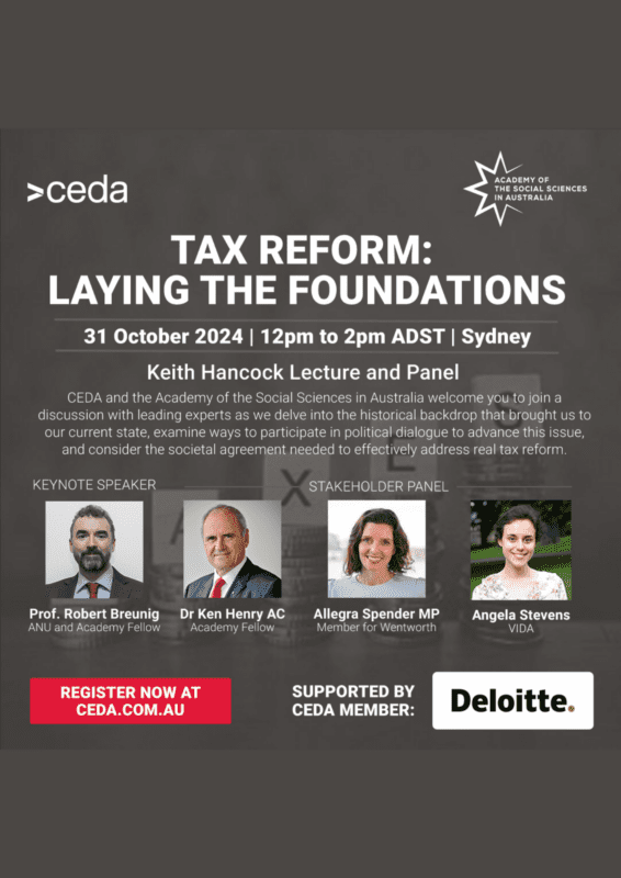 CEDA in partnership with the Academy of the Social Sciences in Australia, is pleased to invite you to participate in a discussion on tax reform with leading commentators. Tax reform […]